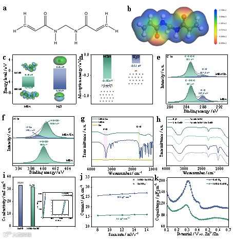 图 2 a-b) MBA分子的分子结构和ESP图谱; c) MBA和H2O的HOMO和LUMO能级; d) MBA和H2O在Zn(002)表面的吸附方式及相应的吸附能; e-f) 锌负极浸泡在30 mM MBA去离子水中的C 1s和N 1s 的XPS光谱; g) 锌负极浸在30 mM MBA去离子水中的FTIR光谱; h) H2O, 30 mM MBA/H2O, 2 M ZnSO4 and 30 mM MBA/2 M ZnSO4 的红外光谱; i) ZnSO4和MBA/ZnSO4电解质的离子电导率; j-k) ZnSO4和MBA/ZnSO4电解液中Zn//Zn对称电池和Zn//Cu不对称电池的双电层电容(EDLC)和微分电容(DC)曲线.