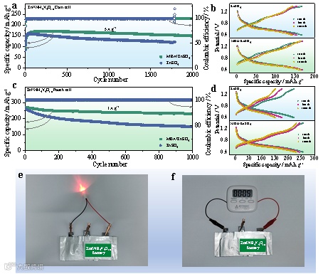图 6 a) Zn//NH4V4O10扣式全电池 5 A g-1的循环寿命图; b) Zn//NH4V4O10扣式电池的恒流充放电-电压分布; c) Zn//NH4V4O10软包全电池 1 A g-1的循环寿命图; d) Zn//NH4V4O10软包电池的恒流充放电-电压分布; e, f) 数码照片显示由两个Zn//NH4V4O10软包电池串联供电的LED灯和秒表。