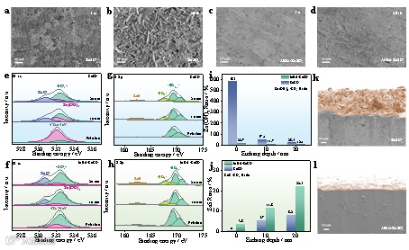 图 4. 第1次和第50次循环后Zn负极的SEM图像 (a-b)在ZnSO4中,c-d)在MBA/ZnSO4中; 以ZnSO4和MBA/ZnSO4为电解液,Zn//Zn对称电池中循环20次后,形成SEI层的O 1s和S 2p光谱的XPS深度分布图, e-f) O 1s 和 g-h) S 2p; ZnSO4和MBA/ZnSO4电解质中i) Zn(OH)2和j) ZnS的XPS峰相对强度比较; 使用k) ZnSO4和l) MBA/ZnSO4电解质,在Zn/ Zn对称电池中循环50次后获得的Zn负极的横截面SEM图像。