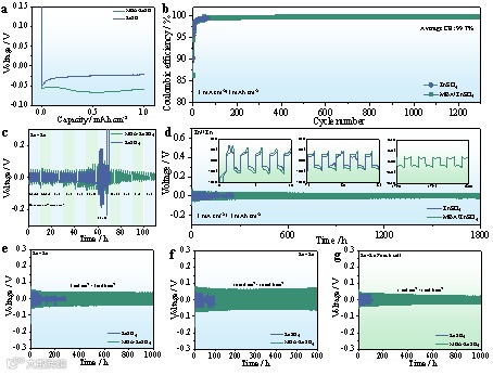 图 5 a) 不同电解质Zn//Cu不对称半电池的初始成核过电位; b) 不同电解质对Zn//Cu半电池CE的影响; c) 不同电流密度和容量下Zn//Zn离子电池的倍率性能; d-f) Zn//Zn纽扣电池在1/5/10 mA cm-2和1/5/10 mA h cm-2下的电压分布图; g) Zn//Zn软包电池在1mA cm-2和1mA h cm-2下的电压分布图。