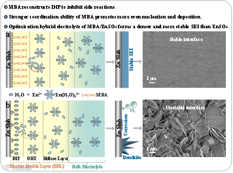 固态电解质界面(SEI)的形成与IHP的化学环境息息相关。为了探究MBA的作用机理,本文通过理论计算和实验相结合,证明了MBA添加剂的主要作用是通过酰胺基团吸附在锌负极表面,在有效调节IHP的结构的同时,不会显著改变Zn2+的溶剂化结构,为生成有益的SEI创造出优异的化学环境。
