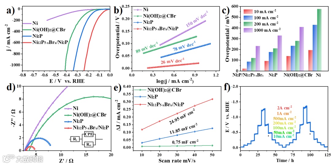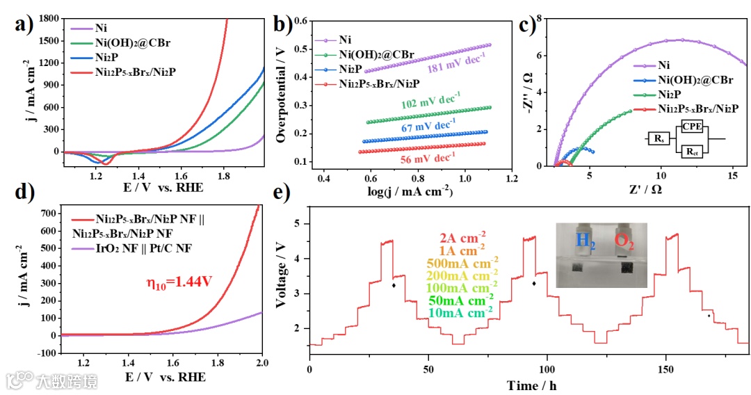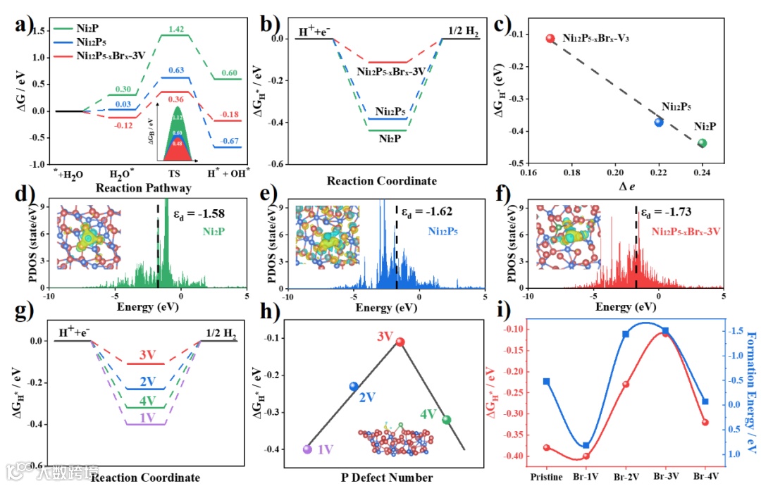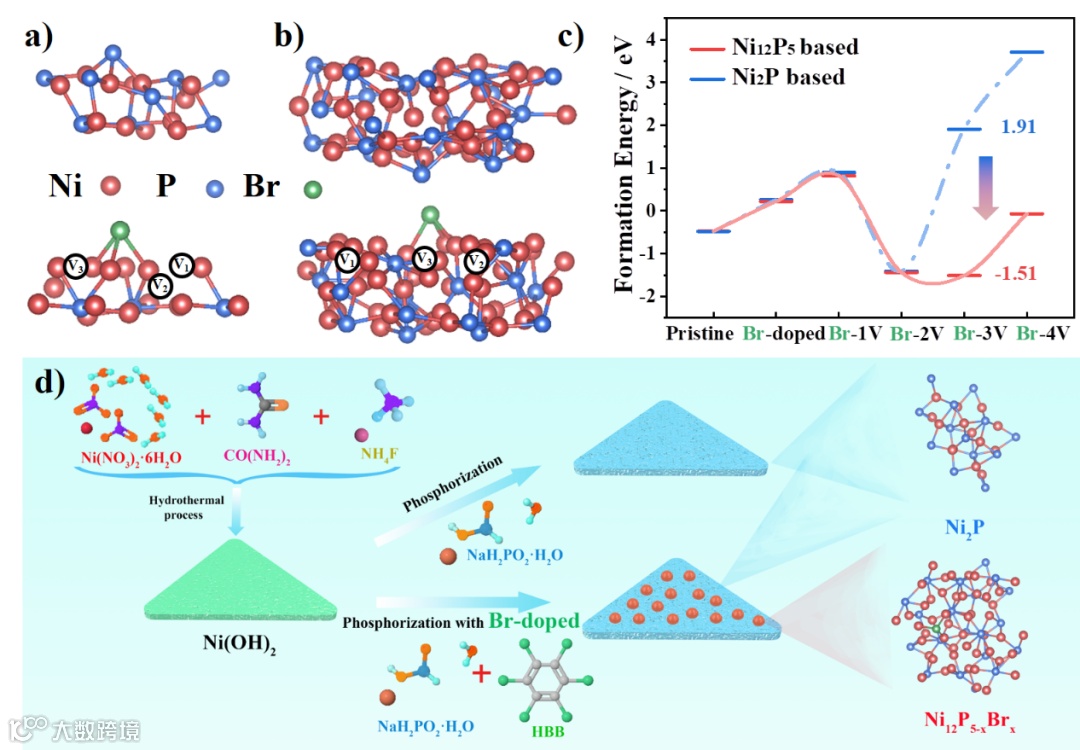 图1 b) Ni12P5和Ni12P5-xBrx-3V的优化理论结构模型。c) Ni2P和Ni12P5基础构型的形成能量:原始、Br掺杂、Br掺杂1个P空位(1V)、2个P空位(2V)、3个P空位(3V)、4个P空位(4V)。d) Ni2P和缺陷Ni12P5-xBrx纳米结构的合成方案。
