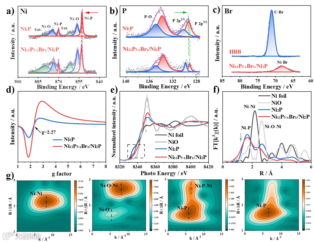图3. a) Ni2P NS和Ni12P5-xBrx/Ni2P NS的Ni 2p, b) P 2p的高分辨率XPS光谱;c) 六溴联苯(HBB)和Ni12P5-xBrx/Ni2P NS的Br 3d。e) Ni K-边的归一化XANES光谱和f) Ni箔、NiO、Ni2P和Ni12P5-xBrx/Ni2P的Ni K-边EXAFS的傅里叶变换。g) Ni箔、NiO、Ni2P和Ni12P5-xBrx/Ni2P的Ni K-边的k3加权EXAFS信号的小波变换图。