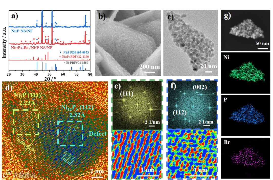图2. a) Ni2P/NF和Ni12P5-xBrx/Ni2P NS/NF的XRD图案。b-d) Ni12P5-xBrx/Ni2P NS的SEM、TEM和HRTEM图像。e) 图2d中绿色方块的快速傅里叶变换(FFT)和反快速傅里叶变换(IFFT)显示了纳米片基材的Ni2P结构。f) 图2d中蓝色方块的快速傅里叶变换(FFT)和反快速傅里叶变换(IFFT),显示了沉淀在纳米片上的Ni12P5的缺陷结构的纳米颗粒。g) Ni12P5-xBrx/Ni2P的STEM图像和相应的Ni、P和Br元素的EDX映射图像。