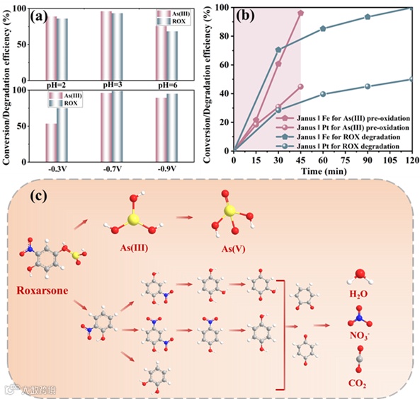 Fig. 3. The effects of applied potential and pH on As (III) oxidation and ROX degradation (a); The As (III) conversion efficiency and ROX degradation efficiency of Janus ‖ Fe in-situ Fenton system and Janus ‖ Pt system (b); The proposed ROX degradation pathway in the Janus ‖ Fe in-situ Fenton system (c).