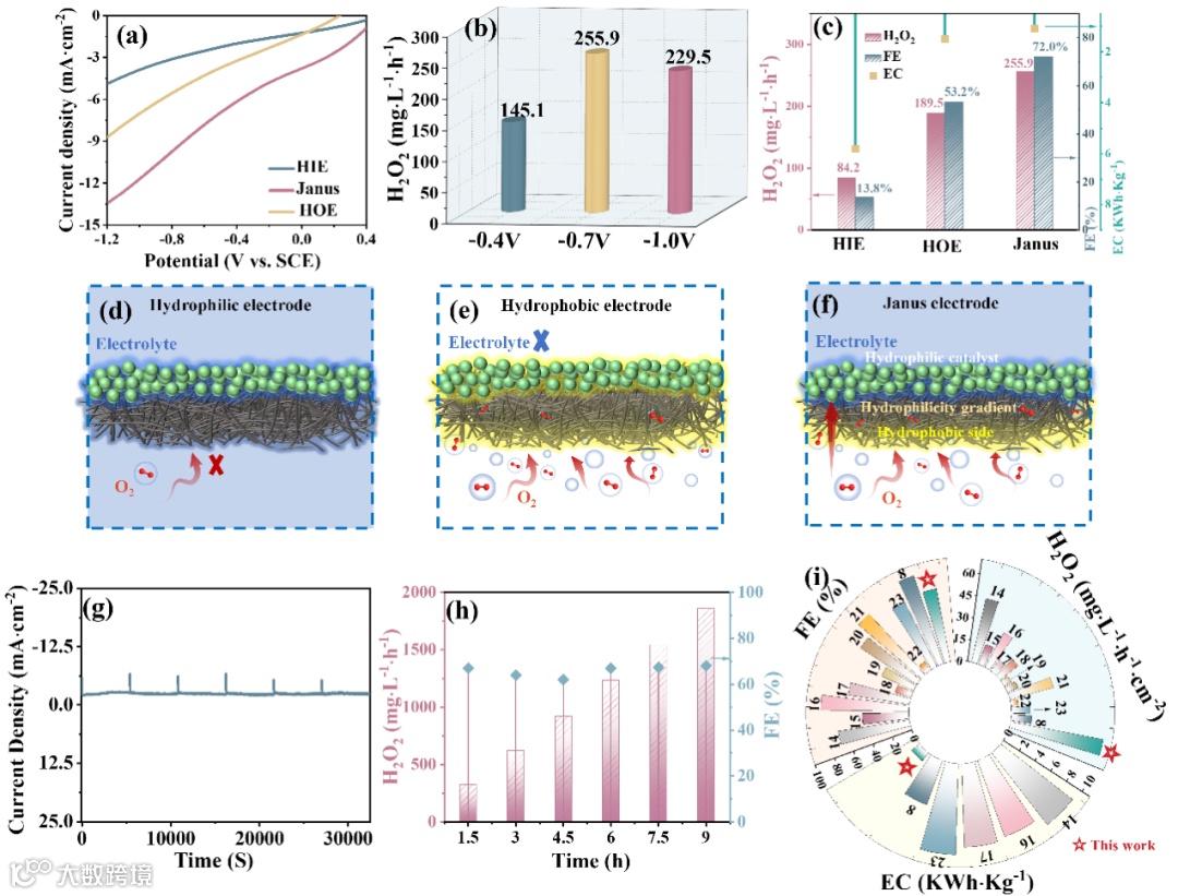 Fig. 2. LSV curves of the Janus electrode, HIE and HOE (a); The effects of applied potential on PEC H2O2 production over the Janus electrode (b); H2O2 yields and FEs of the Janus electrode, HIE and HOE (c); Schematic illustration of transport and reaction pathways on HIE (d), HOE (e) and the Janus electrode (f) for ORR; Stability experiment for the PEC H2O2 production with the Janus electrode (g); H2O2 yield and FEs for the Janus electrode at - 0.7 V after electrolysis in O2-saturated 0.1 M Na2SO4 for 9 h. Irradiation conditions were λ > 420 nm (300 W Xenon lamp fixed at 100 mW∙cm-2 with a cutoff filter). (h); Comparison with other electrodes for H2O2 production (i).