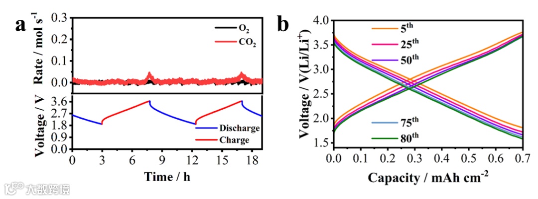 图4. 封闭式锂-锂氧化物电池的在线电化学质谱表征结果和循环性能。