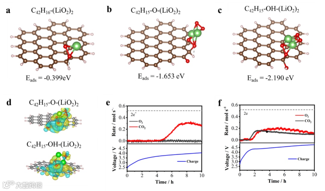 图2. 优化后的DFT结构模型、相应的吸附能以及差分电荷密度示意图;相应的以富含氧官能团的还原氧化石墨烯为正极和热处理后的还原氧化石墨烯为正极的锂-氧气电池的充电过程在线电化学质谱监测结果。
