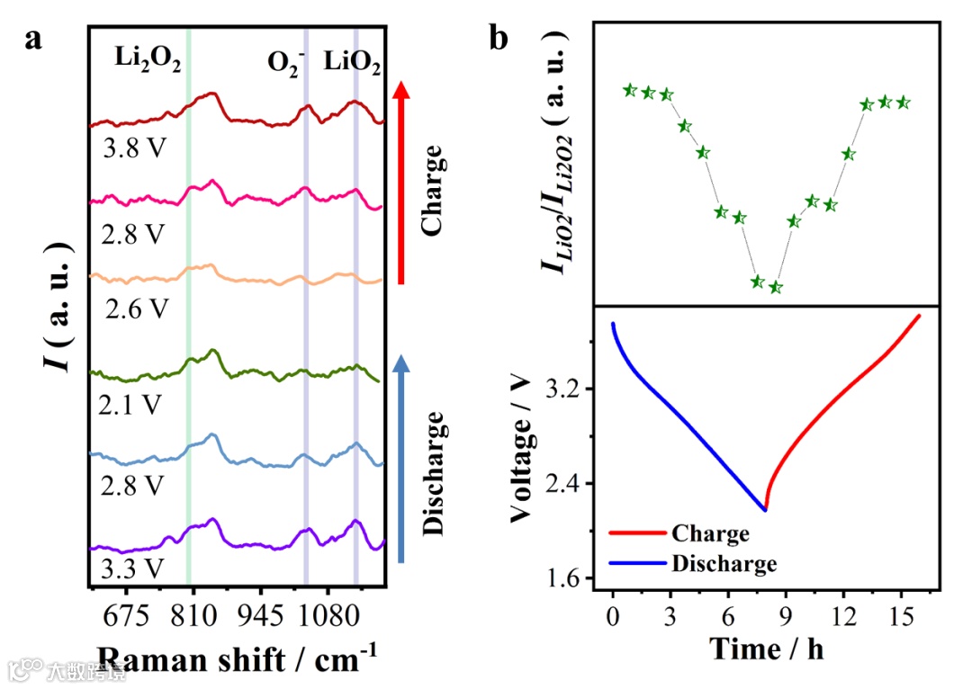 得益于富氧官能团的还原氧化石墨烯对超氧化锂的稳定作用,可实现正极上超氧化锂与过氧化锂之间的可逆反应。原位拉曼测试结果显示,在充电过程中,正极上归属于过氧化锂的拉曼特征峰逐渐减弱,归属于超氧化锂的拉曼特征峰逐渐增强,而在放电过程中,正极上归属于过氧化锂的拉曼特征峰逐渐增强,归属于超氧化锂的拉曼特征峰逐渐减弱。此原位拉曼表征结果证实了正极上超氧化锂与过氧化锂之间的可逆反应。