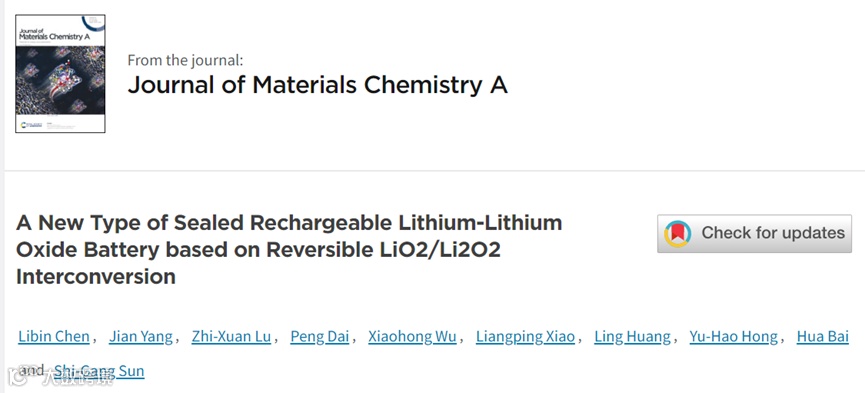 基于此,来自厦门大学的孙世刚院士团队在国际知名期刊Journal of Materials Chemistry A上发表题为“A New Type of Sealed Rechargeable Lithium-Lithium Oxide Battery based on Reversible LiO2/Li2O2 Interconversion”的文章。