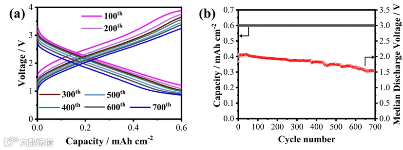 图5. 优化电解液后封闭式锂-锂氧化物电池的充放电曲线和循环性能。