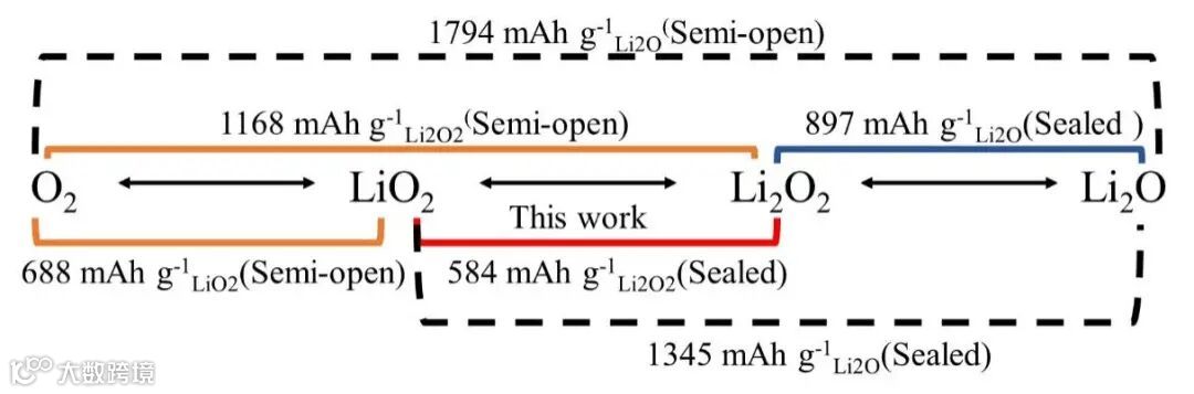 图1. 从半开放式锂-氧气电池到封闭式锂-锂氧化物电池的产物转换结构图。