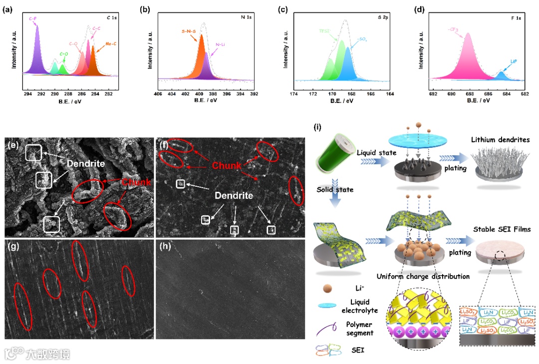 图4 F-Mo2C电池100次循环后负极-电解质界面XPS高分辨率光谱:(a) C1s,(b) N1s,(c) S2 p,(d) F1 s;100次循环后锂负极的SEM图:(e) 液态电解质,(f) LCPP聚合物电解质,(g) P-Mo2C-聚合物电解质,(h) F-Mo2C-聚合物电解质;(i) 锂离子在F-Mo2C-聚合物电解质中的沉积机理