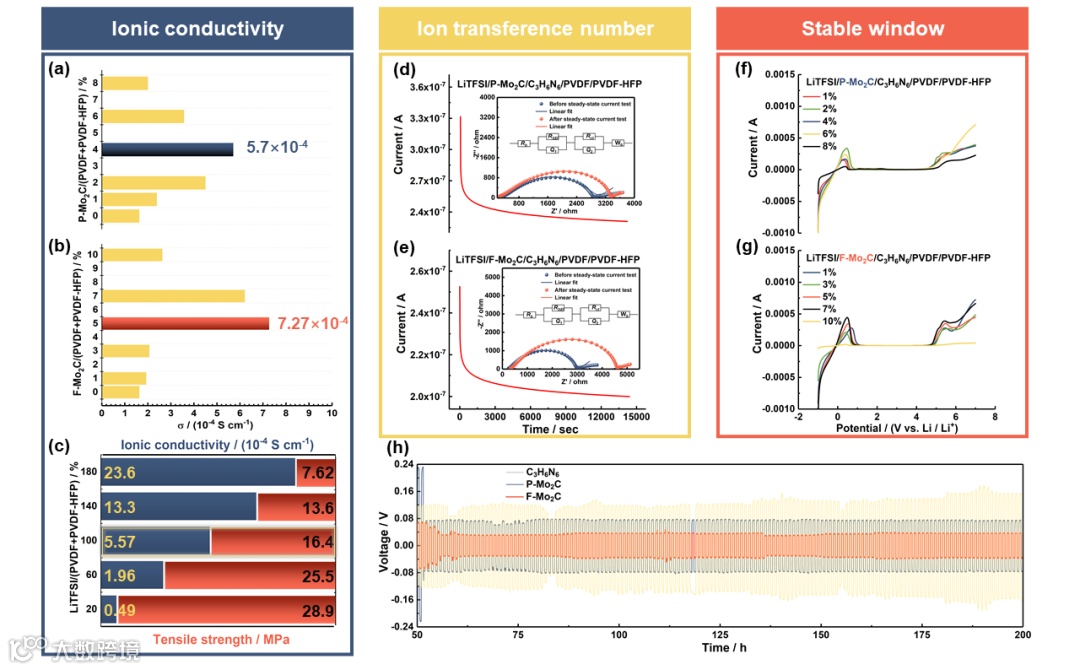 图2 (a), (b)P-Mo2C和F-Mo2C含量对聚合物电解质离子电导率的影响;(c)不同LiTFSI含量对聚合物电解质离子电导率和拉伸强度的影响;(d), (e)P-Mo2C和F-Mo2C-聚合物电解质的锂离子迁移数;(f), (g)P-Mo2C和F-Mo2C-聚合物电解质的电化学稳定窗口;(h)对称电池恒流极化测试曲线