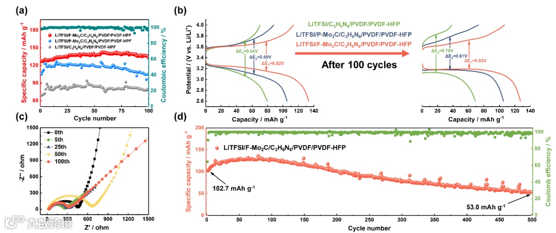 稳定的SEI膜是锂离子导体和电子绝缘体。F-Mo2C-聚合物电解质与负极反应产生锂化合物,因此生成的SEI膜可以更稳定地存在,并缓解了电化学循环中SEI膜的分解。与液体电池相比,锂枝晶在100次循环后减少。P-Mo2C电池的锂负极表面枝晶趋于有序和规则,而F-Mo2C电池循环后的锂负极的表面几乎没有锂枝晶产生。