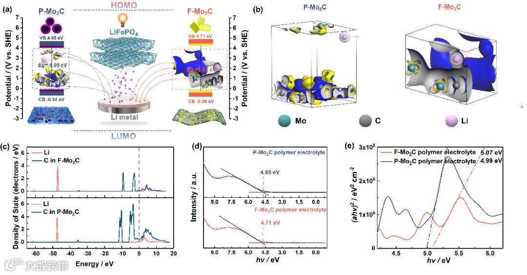图1 (a) Mo2C-聚合物电解质机理示意图;(b)锂离子在F-Mo2C和P-Mo2C上的差分电荷密度;(c) 锂离子与Mo2C表面作用后的碳和锂离子分态密度图;(d) Mo2C-聚合物电解质的XPS价带谱 (e) Mo2C-聚合物电解质带隙