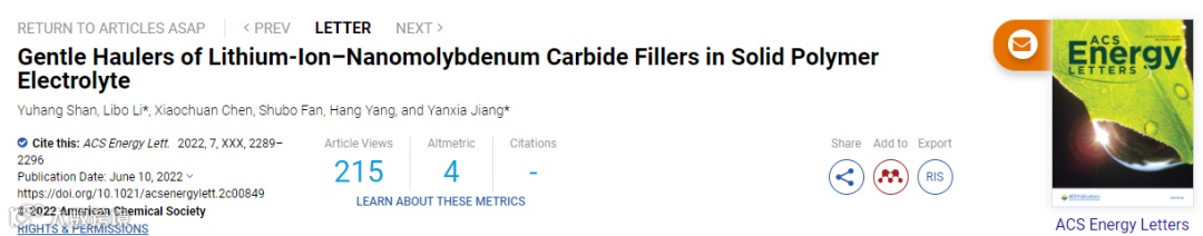 Gentle Haulers of Lithium-Ion–Nanomolybdenum Carbide Fillers in Solid Polymer Electrolyte, ACS Energy Letters, 2022, 7, 2289-2296.