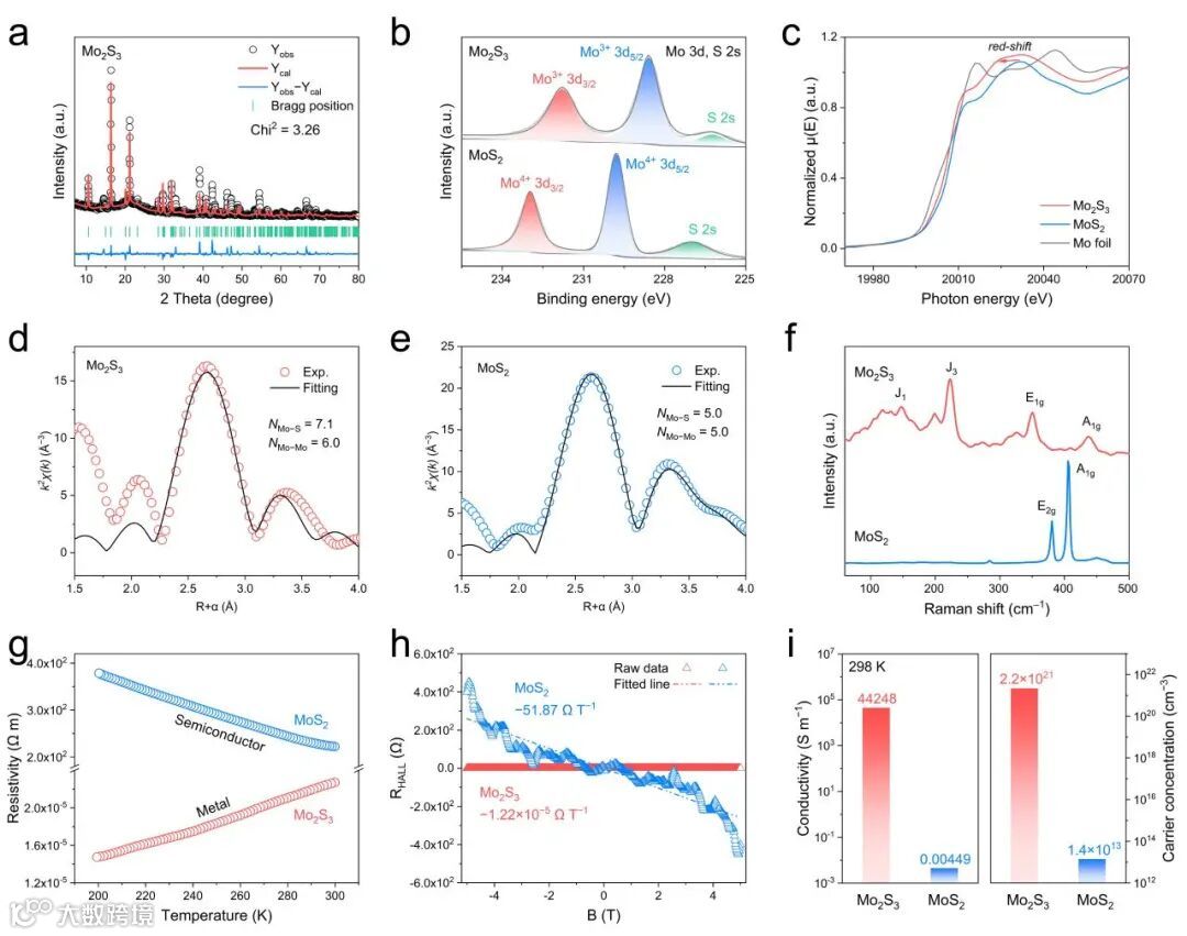 图1. 由2D MoS2与1D [MoS]基元设计的Mo2S3晶体结构、DFT计算及微观形貌。