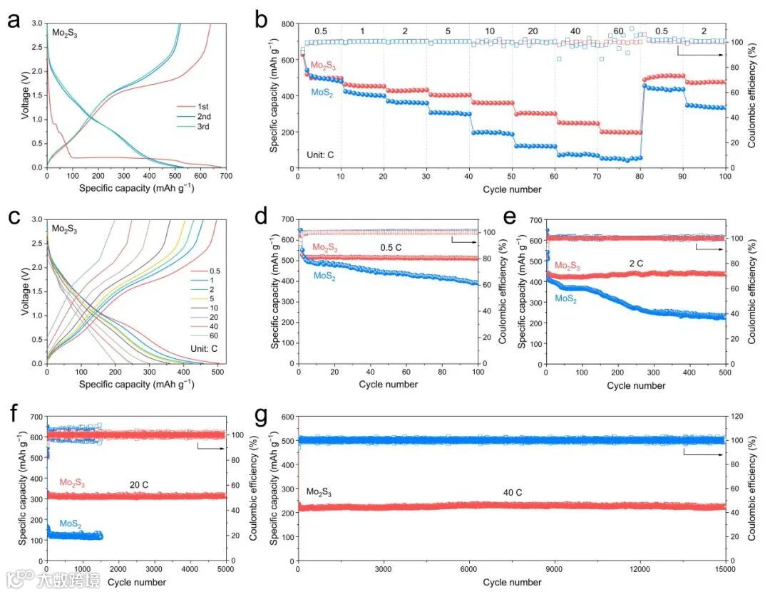 综上,通过在二维MoS2层间引入一维富电子[MoS]链,可破坏z方向对称性诱导晶体结构中发生小极化子坍塌,进而获得高于MoS2的107倍本征电子导电率,并诱导阴离子电子离域降低钠离子扩散能垒。基于该策略获得的Mo2S3材料在钠离子电池中具有极优的快充性能(60 C=1分钟充满)与超长循环稳定性(1.5万圈)。该研究工作证明了极化子工程对储能电极材料本征电子/离子传导的显著提升,为设计和开发新型高性能快充电极材料提供新的思路。