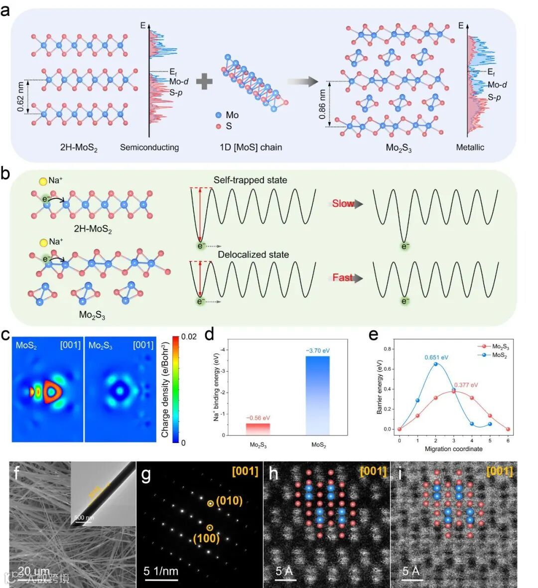钠离子电池因钠资源储量丰富与安全性高等优势,可作为锂离子电池的有效补充。目前,钠离子电池能量密度与快充特性的提升对其快速发展意义重大。二硫化钼(2H相MoS2)作为经典负极材料具有高理论比容量,但由于极化子引发的缓慢电荷转移,其倍率性能及氧化还原可逆性通常较差。传统改性策略通常基于纳米尺寸/孔隙调控、碳复合结构设计等,虽电化学性能有所改善但其低体积能量密度限制实际应用。相转变工程可构建导电1T相MoS2,但亚稳特性使其在循环过程中重新堆叠向稳态2H相转变,使电化学性能下降。因此,如何通过对MoS2本征晶体结构进行合理设计,开发兼具高倍率与长循环寿命的新型热力学稳定硫化钼基负极材料具有挑战性。