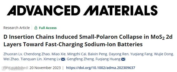 Zhuoran Lv, Chendong Zhao, Miao Xie, Mingzhi Cai, Baixin Peng, Dayong Ren, Yuqiang Fang, Wujie Dong, Wei Zhao, Tianquan Lin, Ximeng Lv*, Gengfeng Zheng, Fuqiang Huang*. 1D Insertion Chains Induced Small-Polaron Collapse in MoS2 2D Layers toward Fast-Charging Sodium-Ion Batteries. Advanced Materials, 2023, 2309637.