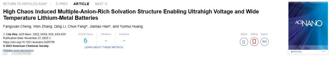 近日,华中科技大学韩建涛、方淳团队在国际知名期刊《ACS Nano》上发表了题为《High Chaos Induced Multiple-Anion-Rich Solvation Structure Enabling Ultrahigh Voltage and Wide Temperature Lithium-Metal Batteries》的研究论文。