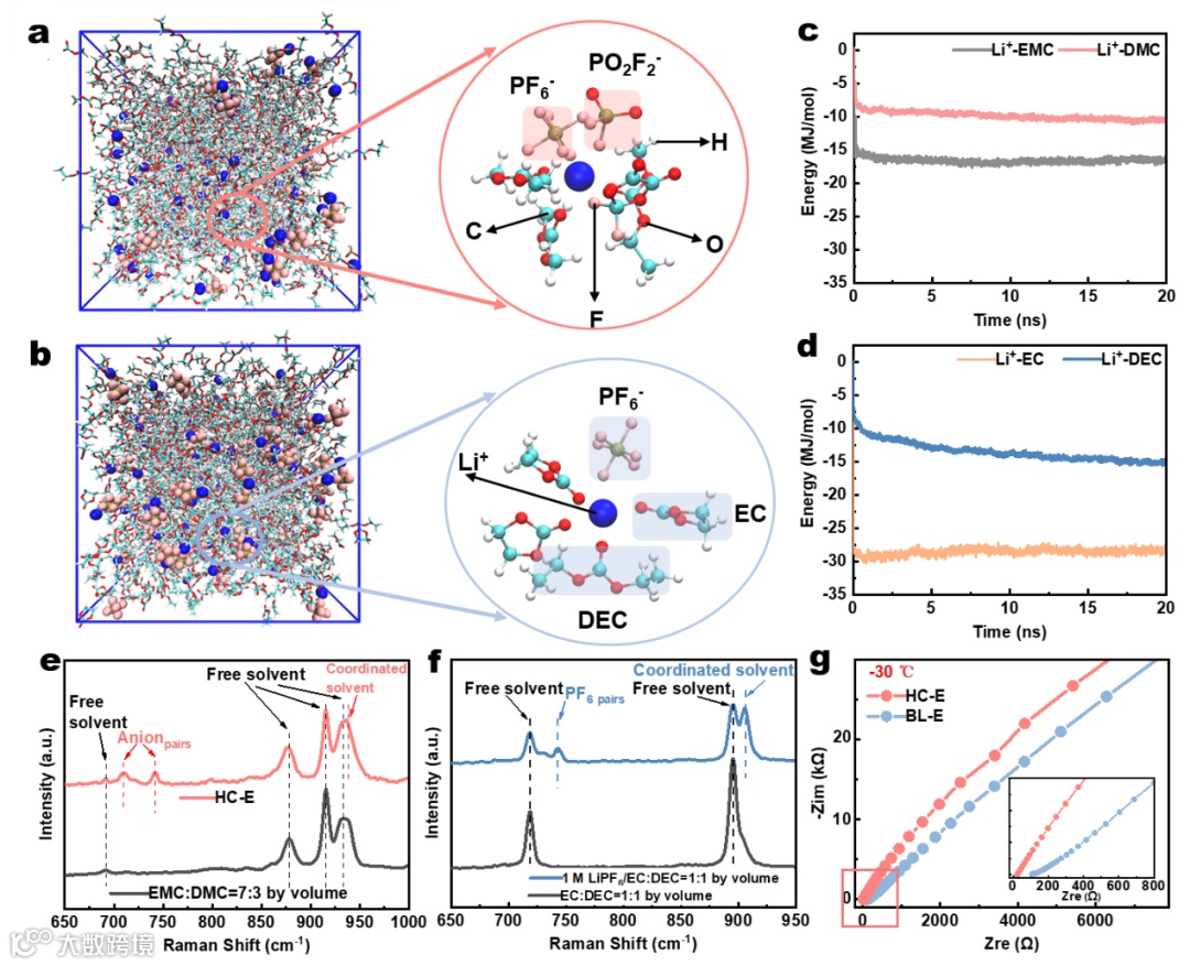 Figure 2. Characterization of solvation structure and ionic conductivity: (a–b) Molecular dynamic simulation: Snapshots of (a) HC-E and (b) BL-E. (c–d) Binding energy of lithium ion and solvent. (e–f) Raman spectra of solvents and electrolytes. (g) EIS tests of the stained steel symmetric cells at −30 °C.