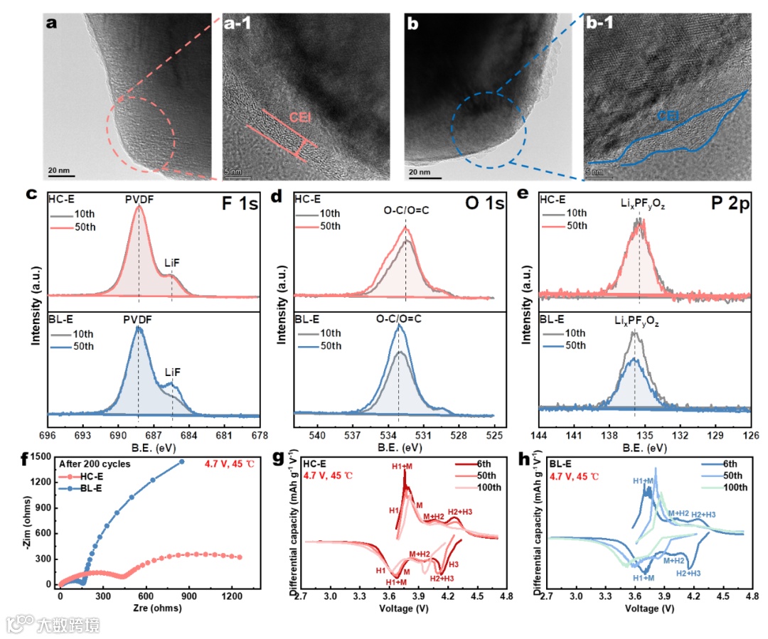Figure 4. Characterizations of the stability mechanism under high voltage (4.7 V) and high temperature (45 °C). (a–b) TEM graphs for NCM811 of the NCM811||Li cell after 200 cycles: (a, a-1) HC-E; (b, b-1) BL-E. (c–e) XPS profiles of the cycled NCM811: (c) F 1s, (d) O 1s, (e) P 2p. (f) EIS tests after 200 cycles of NCM811||Li cells at 45 °C. (g–h) dQ·dV–1 curves for different cycles at 2.7–4.7 V and 45 °C: (g) HC-E; (h) BL-E.