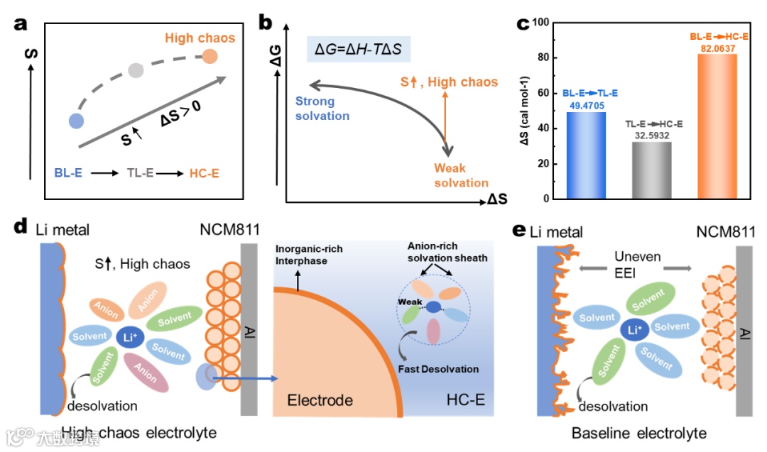 Figure 1. Design mechanism diagram of the high chaos electrolyte: (a–b) Design concept of improving chaos. G, H, and S stand for solvation free energy, enthalpy, and entropy, respectively. (c) Calculated entropy change values. (d–e) Optimization mechanism of the HC-E electrolyte.