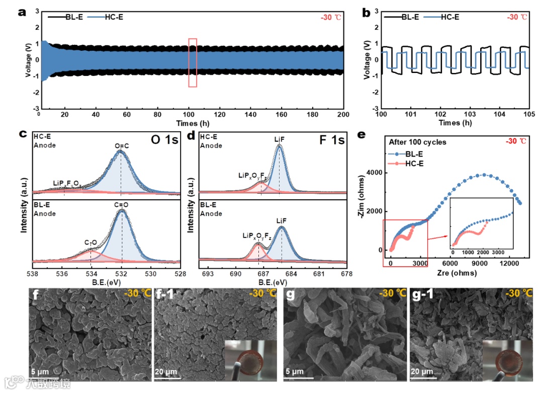 采用电化学阻抗谱(EIS)研究了不同电解液在25 °C和−30 °C下的离子电导率。从25 °C到−30 °C,BL-E的阻抗急剧上升超过100 Ω,而HC-E的阻抗仅增加到20 Ω,如图S5和图2g所示。显然,HC-E在低温下表现出比BL-E更高的体相离子电导率。这些也与图S6 的结果相对应,其中HC-E在低温下保持为液体,而BL-E已经凝固。