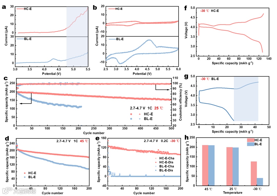 NCM811||Li电池在25 ℃,4.7 V高压下在不同电解液中的循环性能如图3c。HC-E电池在500次循环后的容量保持率大于80%,而BL-E电池在200次循环后容量保持率小于60%。在45 ℃和4.7 V下,HC-E电池在200次循环后的容量保持率接近80%,远高于BL-E电池的42%(图3d)。NCM811||Li电池在高压和低温下的循环性能如图3e所示。当温度进一步降低到-30 ℃时,在0.2C和4.7 V下充放电的HC-E电池的初始放电比容量高达126 mAh g-1,200次循环后仍有92 mAh g-1,而BL-E电池的容量几乎是不可逆的(图3e)。NCM811||Li电池在2.7-4.7 V和-30 ℃下的充放电曲线如图3f-g所示。HC-E电池出色的低温性能意味着在电解液中的锂离子动力学更优异。