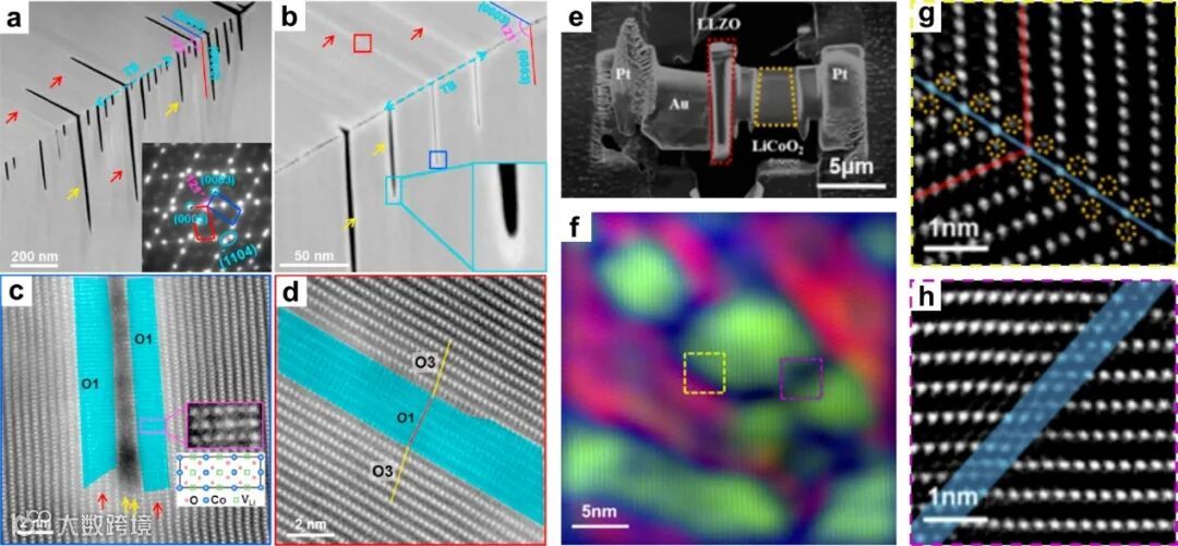 LCO颗粒中常常存在相干孪晶界和反相孪晶界两种界面。这些孪晶界作为固有的结构面缺陷,可以在合成和Li脱嵌过程中原位产生,并成为反位、裂纹和不可逆相变发生的起点,导致结构破坏及其向颗粒内部的延申。
