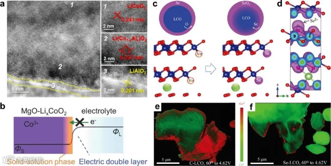 LCO表面与电解液之间的界面副反应是不可避免且不可逆的,这些反应会在LCO表面生成CEI膜。这种膜由多种无机、有机组分共同形成的,对载流子传输和阻抗有重要影响。CEI膜的组分可能是动态的,会随电化学过程变化并与负极的SEI膜有一定关联。界面副反应还会导致LCO表面结构相变。一般来说,LCO表面结构变化受到电压、温度和循环次数等因素的影响,会从层状结构依次逐渐转变为尖晶石和岩盐相结构。这些结构变化会伴随Co价态的改变,而还原产生的Co2+容易离开LCO表面、进入电解液、迁移至负极上,破坏SEI膜并最终沉积于负极表面,进一步加剧电化学性能的衰减。