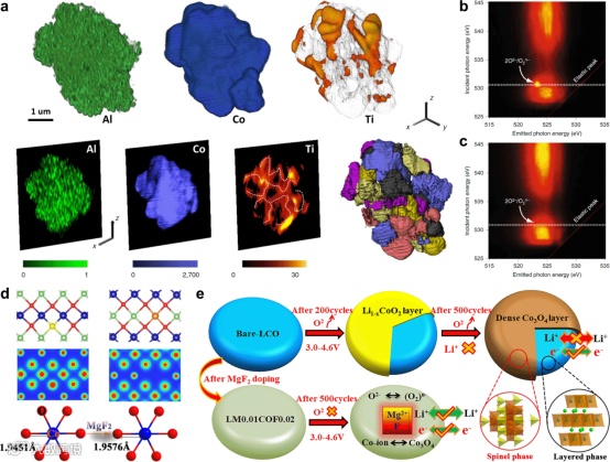 杂元素掺杂是稳定LCO体相结构的最有效策略之一。掺杂元素可以占据LCO晶格中的Li、Co和O格位,从而在原子尺度上调控LCO的结构,提高高电压下的结构稳定性。然而,由于掺杂元素含量较低,研究清楚其在LCO结构中的均匀性、掺杂形式和局域结构等仍然存在一定困难。目前对掺杂元素作用的研究往往是通过对比掺杂前后的结构和性能来间接了解的,这阻碍了对掺杂元素作用的深入理解。一般来说,杂质元素在LCO晶格中的存在会破坏原有结构属性并影响结构应力,从而缓解了电化学过程中的结构应变,有助于提高结构稳定。