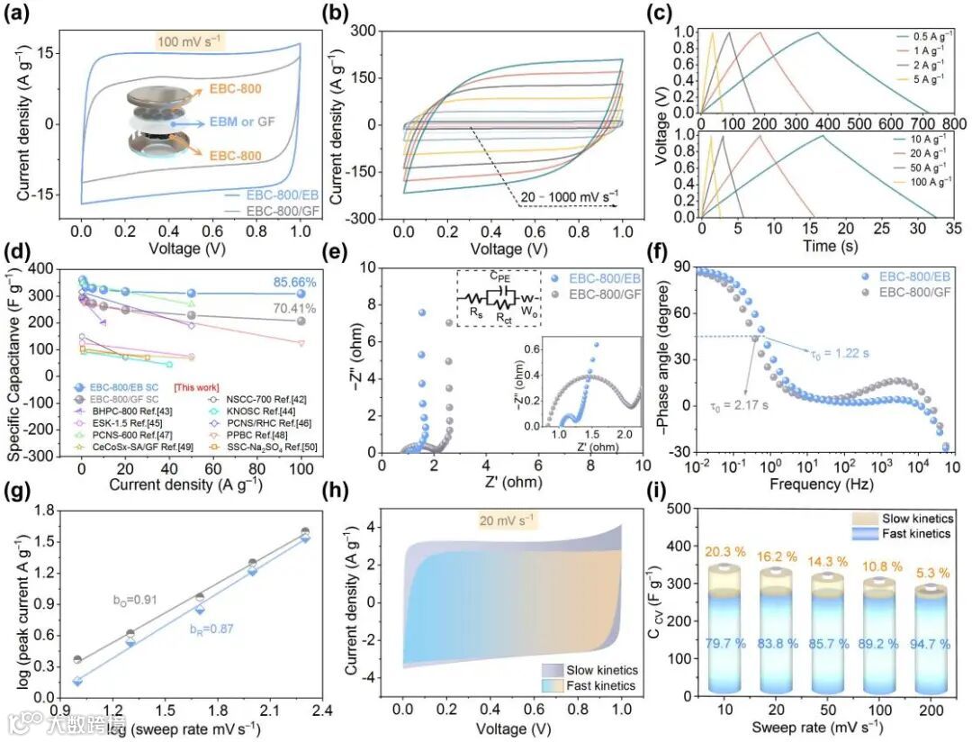 图5. EBC-800/EBM对称超级电容器在6M KOH电解质中的电化学性能研究。