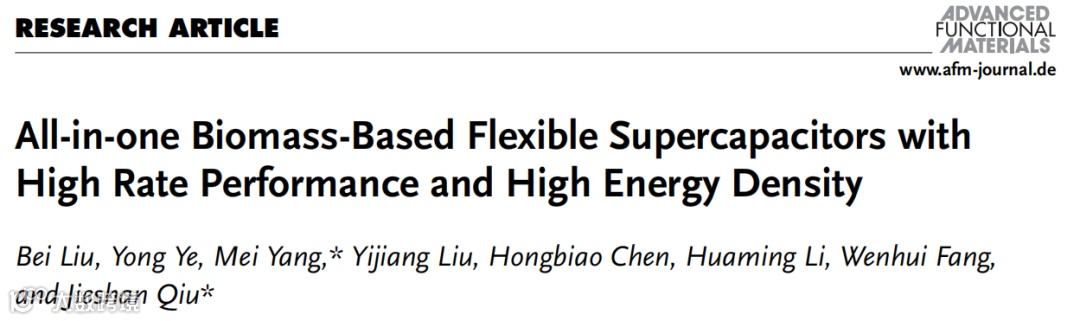 Bei Liua,b, Yong Yea, Mei Yanga*, Yijiang Liua, Hongbiao Chena, Huaming Lia, Wenhui Fangc, Jieshan Qiuc*, All-in-one biomass-based flexible supercapacitors with high rate performance and high energy density, Adv. Funct. Mater. 2023, DOI: 10.1002/adfm.202310534 .