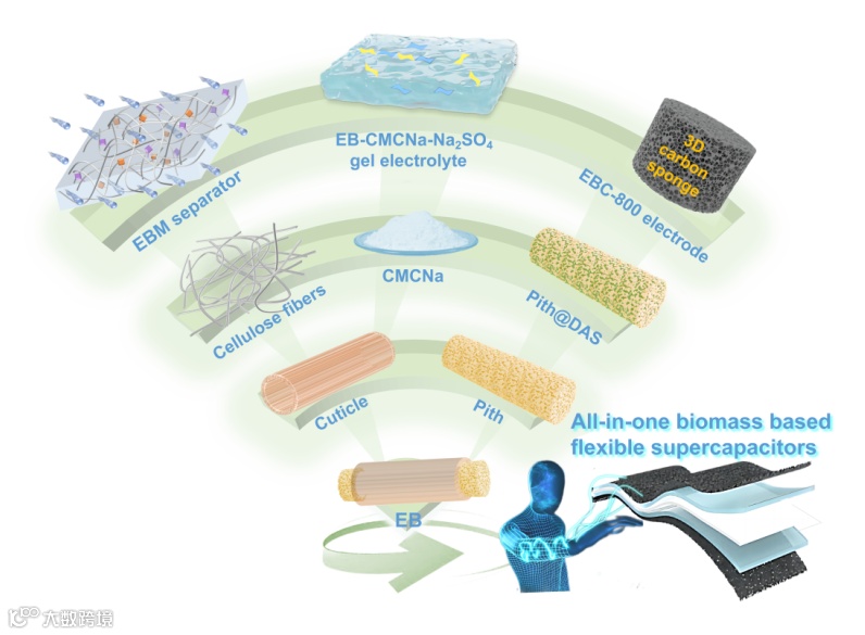 图2. 基于禾本科秸秆(EB)的一体式柔性超级电容器的制备流程示意图。