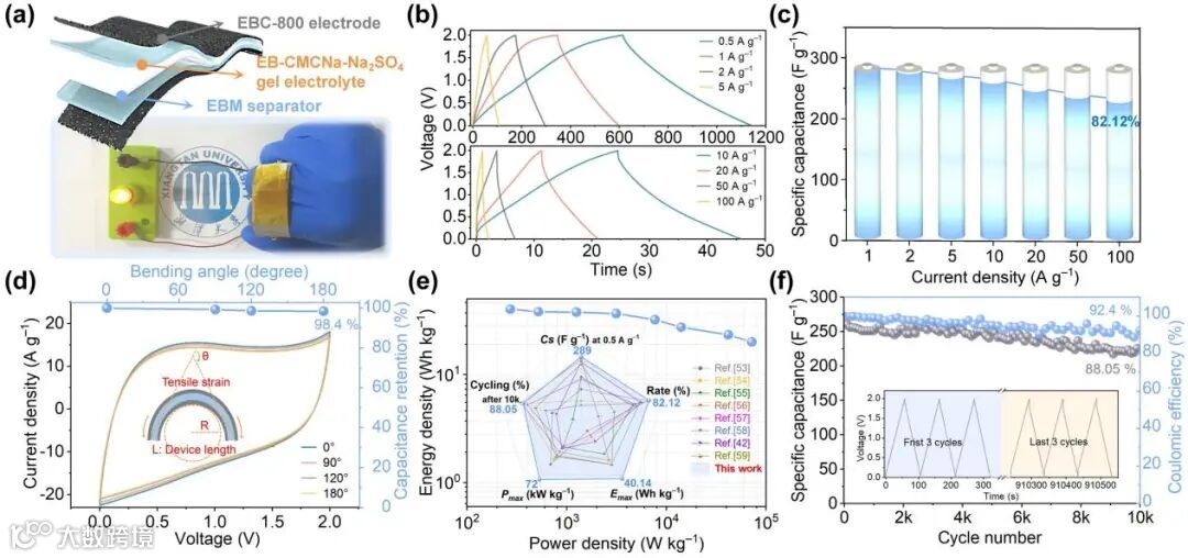 湘潭大学刘备/阳梅副教授与北京化工大学邱介山教授合作全方位利用禾本科秸秆创新性地构建了一种全生物质一体化柔性超级电容器。首先,利用秸秆外皮制备了兼具优异柔韧性、润湿性和离子导电性的纤维隔膜(EBMs),同时利用外皮提取的羧甲基纤维素钠盐制备了凝胶电解质(CMCNa-Na2SO4);再将去除外皮后的茎髓经硫化碳化法制备了具有分级多孔结构和高N/S含量的3D泡沫碳电极(EBC-800)。基于EBC-800、EBM和CMCNa-Na2SO4凝胶电解质构建的柔性一体式超级电容器(BFS)表现出高的比电容(274 F g−1@1 A g−1)、超高倍率性能(82.12%,1-100 A g−1)、高能量密度(40.14 Wh kg−1)和出色的柔韧性。这些优异的电化学性能超过了迄今为止报道的生物质基柔性超级电容器。本文从分子化学工程和产品工程角度阐明了生物质的增值高效利用,并为构筑一体式高性能柔性储能器件提供了新思路。