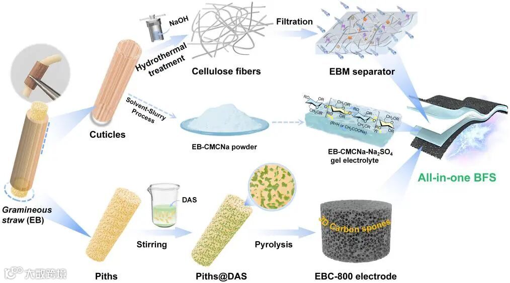 超级电容器(SCs)的电化学性能主要取决于电极、隔膜和电解质三个关键组分。目前报道的SCs常使用金属氧化物/聚合物基电极以及腐蚀性液体电解质,普遍存在高成本、低安全性以及环境污染问题,探寻经济高效、环境友好和性能优越的电极、隔膜和电解质,是制备低成本高性能SCs的关键。目前生物质已广泛用于制备粉末碳基电极材料,制备生物质衍生的隔膜和电解质的报道较少,特别是利用同一种生物质原料制备三个关键组分(包括电极材料、隔膜和电解质)组装一体式超级电容器的研究未见报道。禾本科秸秆(EB)是一类常见的农业生物质,种类繁多,结构优势明显,富含纤维素、半纤维素和木质素。其中EB的外皮纤维含量高(~64.02%),是生产纤维隔膜和羧甲基纤维素钠(CMCNa)固态凝胶电解质的良好前驱体。同时,EB秸秆的茎髓疏松多孔,富含纤维素、蛋白质、脂肪和多种氨基酸(44.44 wt% C、49.39 wt% O、6.17 wt% H),又是制备3D多孔泡沫碳材料的良好前驱体。因此,禾本科秸秆是构建高效一体式柔性超电的理想前驱体。