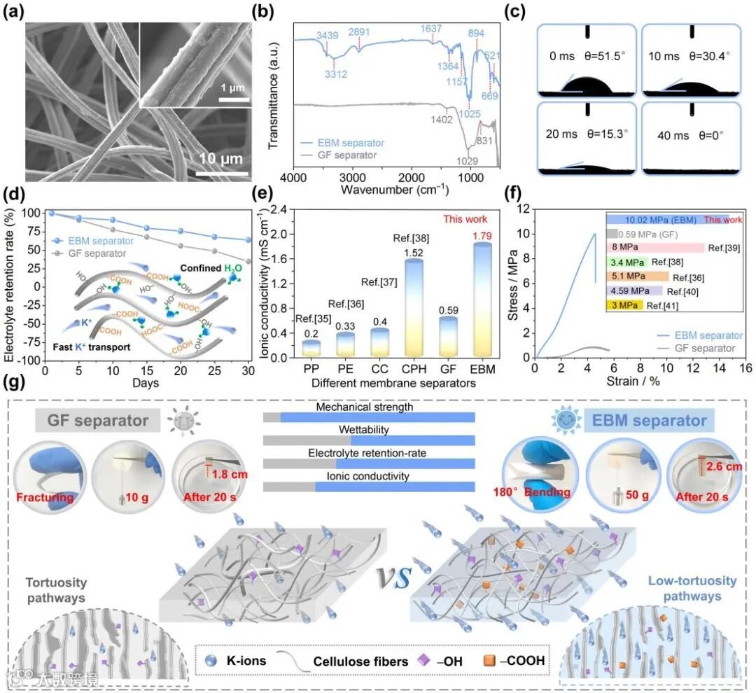 图3. 秸秆外皮衍生纤维隔膜(EBM)的结构表征和理化性质。