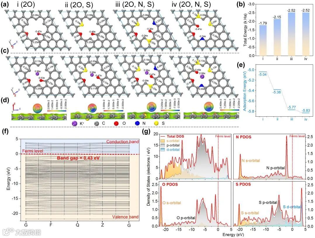 图6. DFT理论计算:不同N/O/S含量EBC-800模型的钾离子吸附能、能带及态密度图。