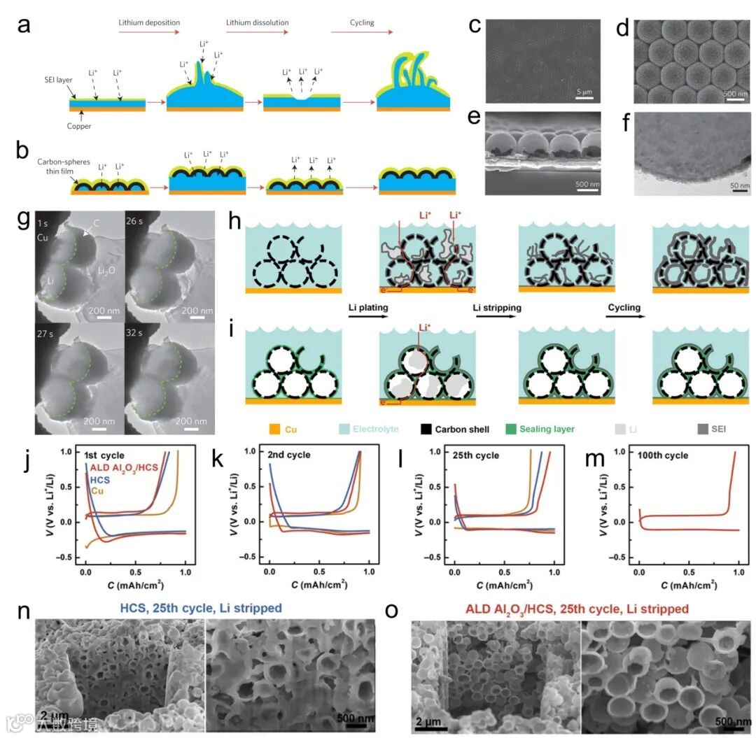 三维碳材料主要包括空心碳、碳纳米球、碳纳米笼。三维多孔碳在促进锂离子扩散的同时,还能够起到抑制枝晶生长和传播的作用。与此同时,它们的中空结构能够诱导锂优先在空腔内沉积,进而减少循环过程中电极体积的波动(图5)。