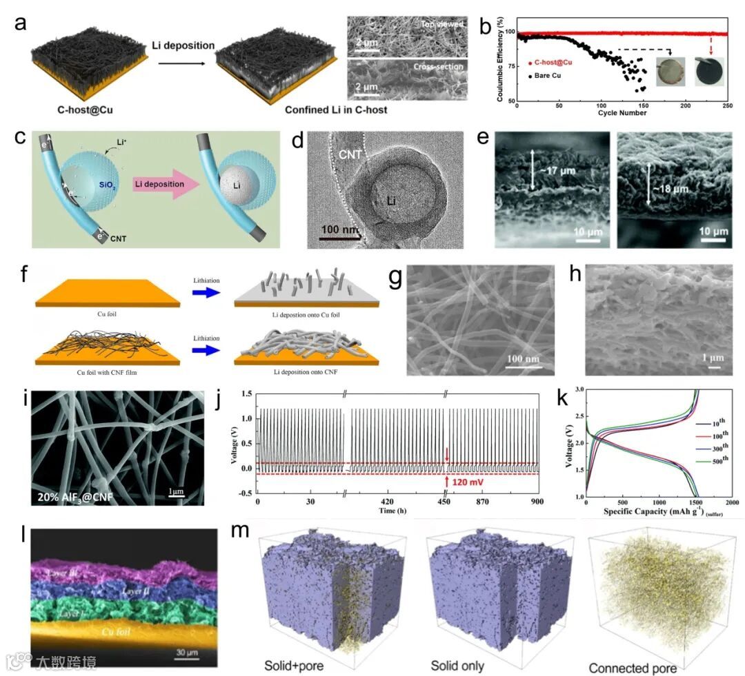 一维碳材料主要包括碳纳米管和碳纳米纤维。该类碳纳米材料具有一维的电子传输通道,同时可在铜集流体上形成导电网络结构,降低电阻并促进锂离子的传输和扩散,有助于实现锂的均匀沉积(图3)。