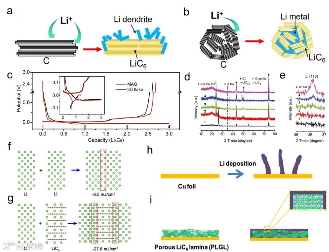 二维碳材料主要包括石墨烯和石墨片。二维碳材料具备较好的机械强度和柔性,可确保锂沉积/脱去过程中的结构稳定性。同时,二维片层结构可在铜集流体表面形成一层保护层,有利于减轻副反应、均匀锂离子通量(图4)。