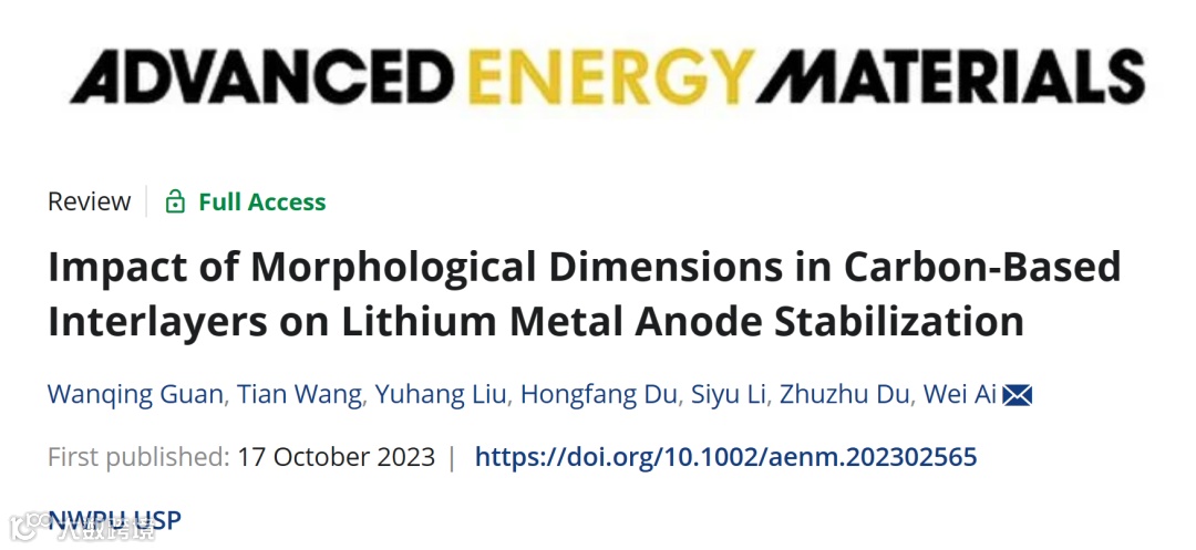 近日,西北工业大学艾伟教授课题组在国际知名期刊Advanced Energy Materials上发表题目为“Impact of morphological dimensions in carbon-based interlayers on lithium metal anode stabilization”的综述文章。该论文对不同维度碳基中间层用于稳定锂金属负极的研究进行了系统性总结, 深入探讨了碳材料作为中间层修饰铜集流体的最新进展,并对不同维度碳材料如何调节锂沉积行为进行了详细的分析。此外,作者还对该领域未来发展进行了展望,旨在为无负极锂金属电池的设计提供指导。