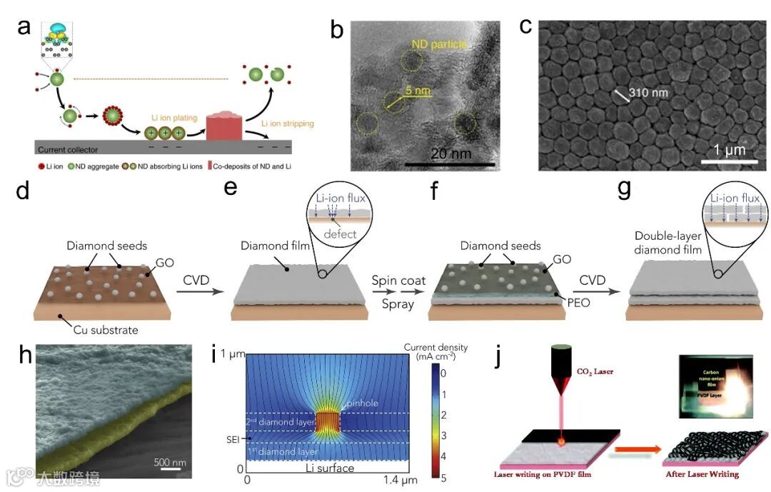 零维碳材料主要包括碳纳米点和碳纳米金刚石。零维碳纳米颗粒由于尺寸小,具有较大的比表面积,能够有效地降低局部电流密度,增强电极与电解液的接触并促进锂离子传输,进而确保电流分布的均匀性。此外,零维碳材料丰富的成核位点也能提供更多的反应中心,从而促进电化学反应的进行(图2)。