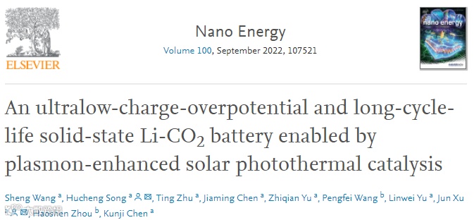 针对此问题,南京大学宋虎成/徐骏团队及合作者在前期提出的太阳能光热电池技术的基础上报道了一种基于原位内建的等离激元异质结构来实现超低充电电位和长循环寿命固态锂-二氧化碳电池的新策略。