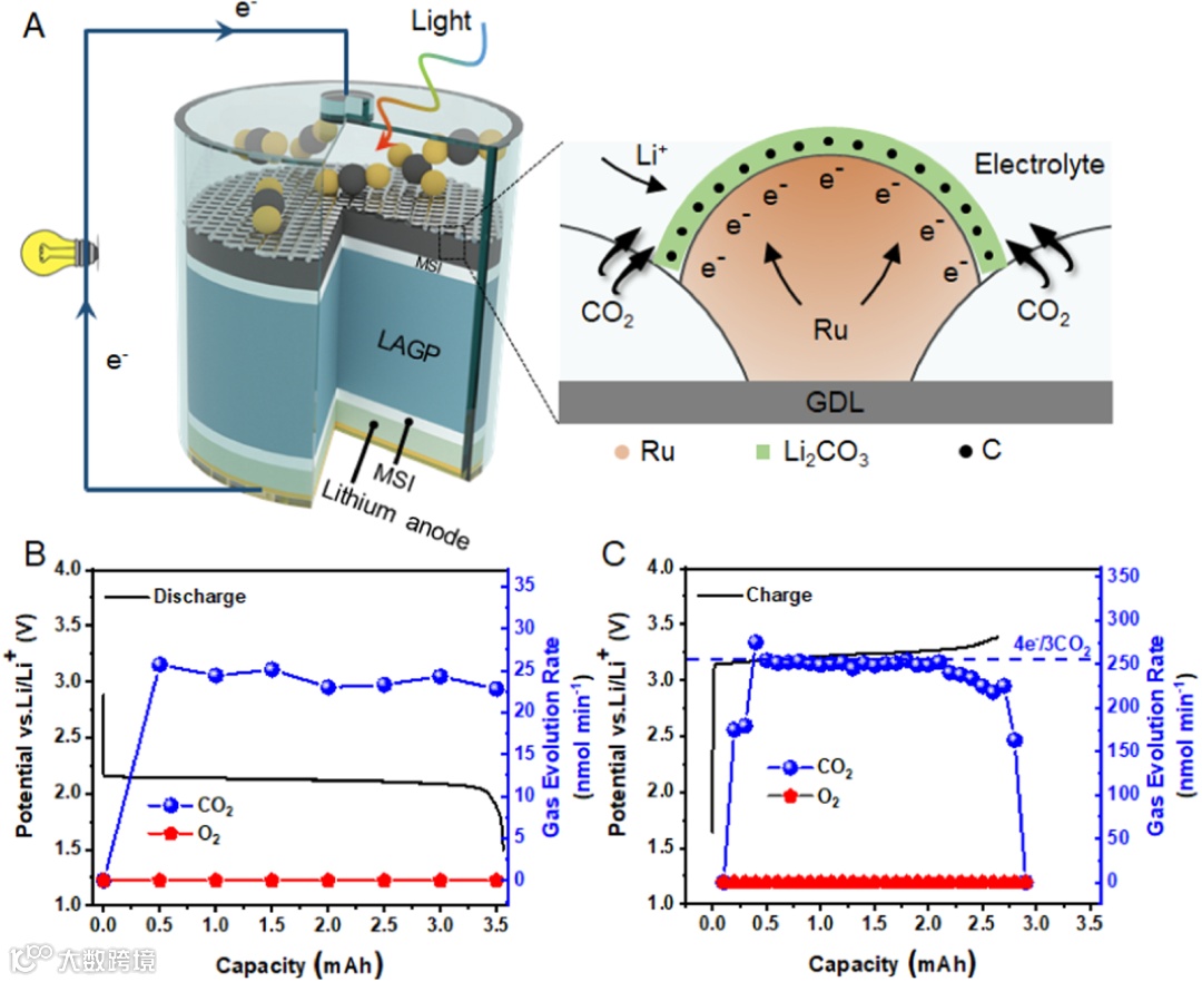 基于该技术,通过设计金属等离激元序构催化剂(Ru和RuO2)来利用廉价丰富的太阳能和空气,他们相继开发了国际首款超低温全固态锂-空气电池(“Solar-driven all-solid-sate lithium-air batteries operating at extreme low temperatures”. Energy Environ. Sci.,2020, 13, 1205-1211)和超宽温全固态锂-空气电池(“An extra-wide temperature all-solid-state lithium-metal battery operating from -73 ℃ to 120 ℃. Energy Storage Mater,2021, 39, 139-145)。然而,空气中的二氧化碳(CO2)气氛极大地恶化了全固态锂-空气电池的循环性能。