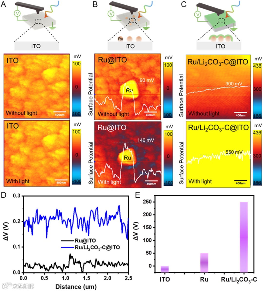 图4 KPFM测得的光照下Ru/Li2CO3基等离激元结表面电势变化。