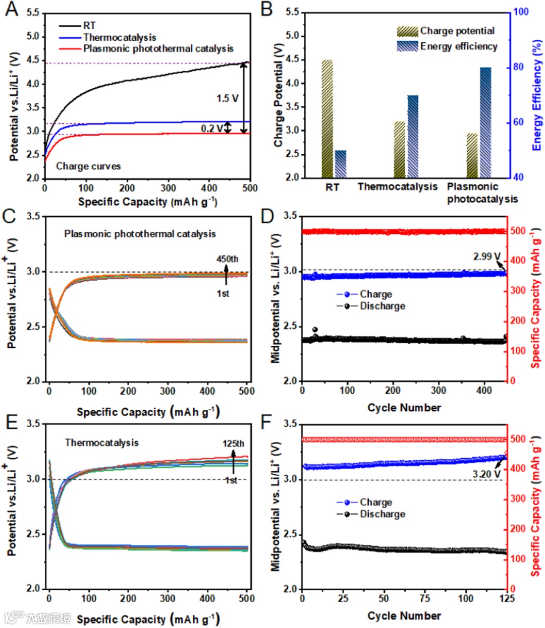 图4中 KPFM结果也进一步证实了我们的设想:Ru/Li2CO3基等离激元异质结在光照射下可以实现热载流子的产生和注入,使其表面电势升高250 mV,进而加速产物分解动力学过程,实现了超低充电过电位(图6)。这种等离激元光-热电协同转换的电池技术为开发下一代高比能金属空气电池提供了重要思路。